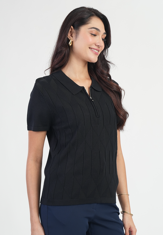 Maren Short Sleeves Polo Neck Diamond Knit Zip Top