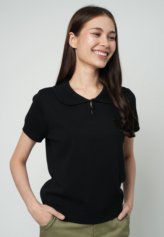 Alessia Knit Top with Peter Pan Collar and Keyhole - BLACK