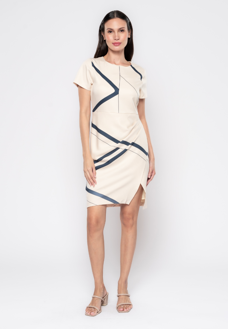 Power dress with the play of lines and shapes print in this classy short sleeves pencil dress.