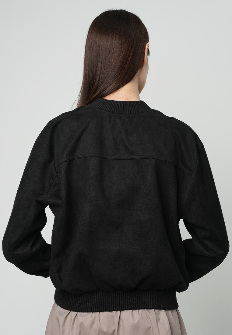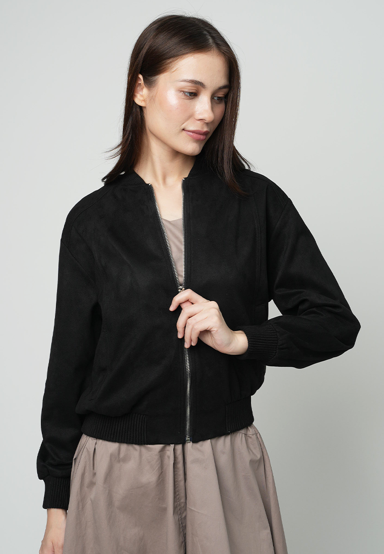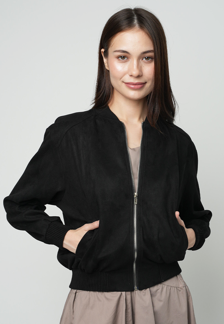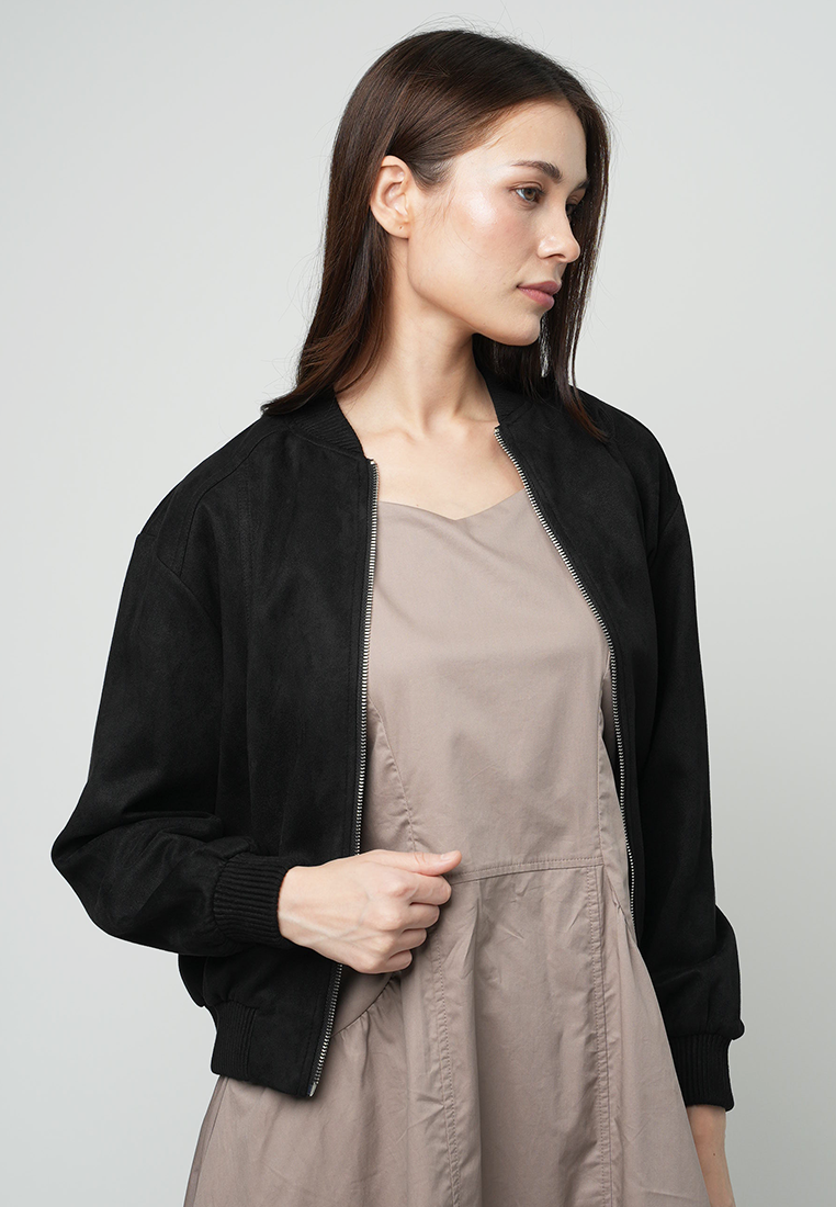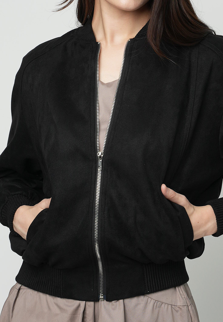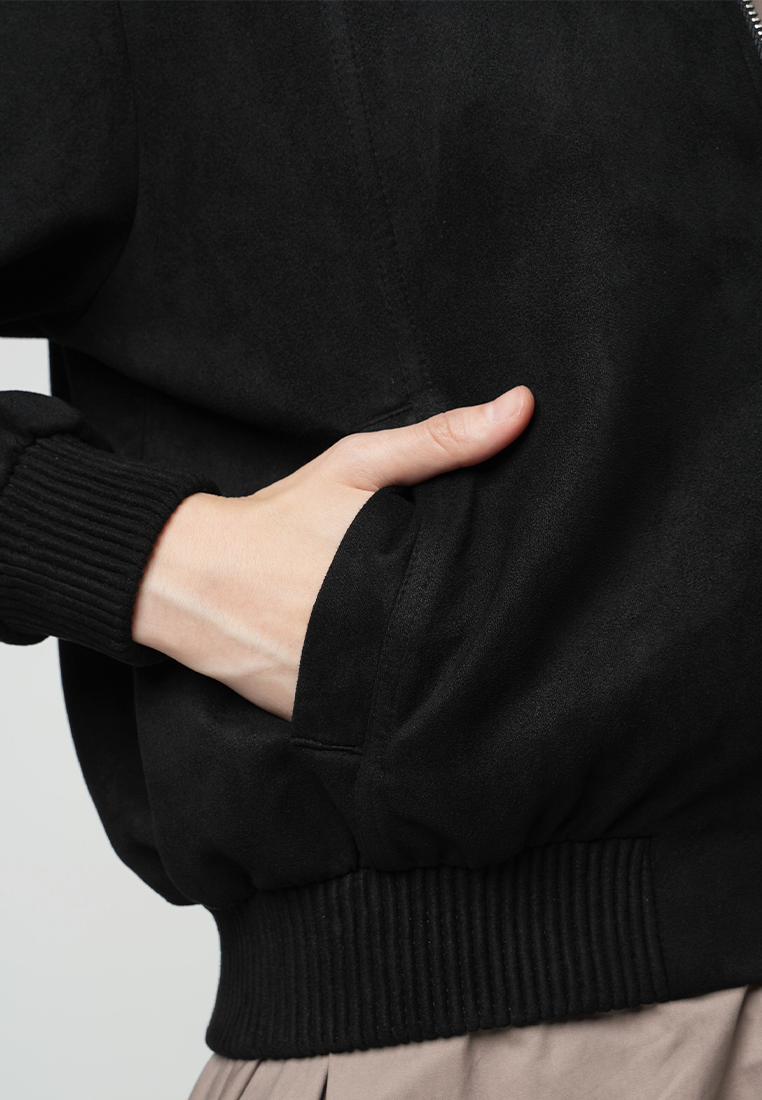 This black bomber jacket, offers a perfect blend of style and comfort. Its sleek design features a classic bomber silhouette, making it a versatile addition to any wardrobe.