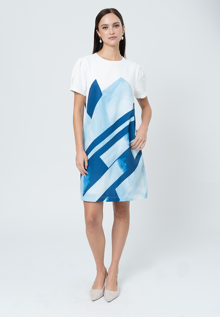 Verity Round Neck Geometric Printed Shift Dress with Semi-Gathered Short Sleeve